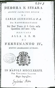 * Debora e Sisara (azione sacra per musica in due atti, Teatro San Carlo, Napoli 13 febbraio 1788, musica di Pietro Alessandro Guglielmi),